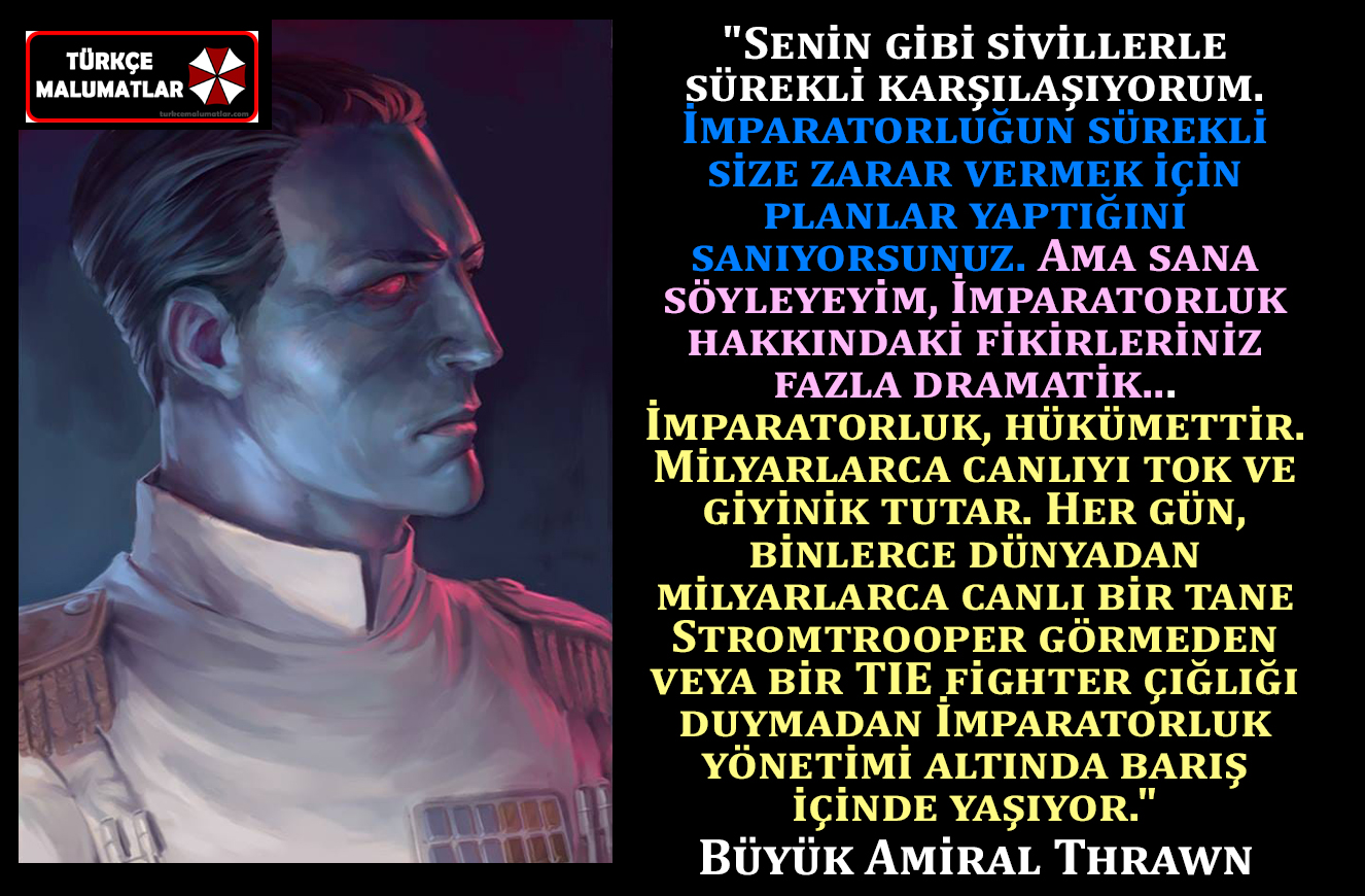 Büyük (Grand) Amiral Thrawn 1991 yılında Tmothy Zahn tarafından yazılan Star Wars İmparatorluğun Varisi romanında geçen kurgusal bir karakterdir. turkcemalumatlar olarak Amiral hakkında çok fazla spoiler vermeden kısa ve net bilgiler vereceğiz.