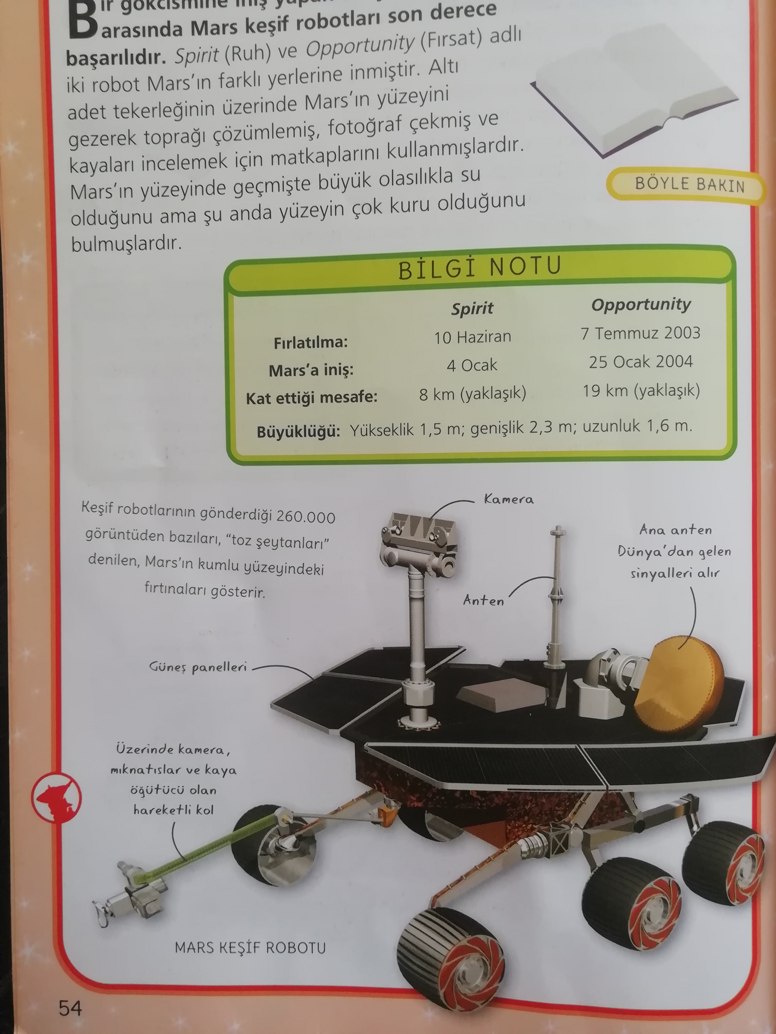 Bir gökcismine iniş yapan uzay sondaları arasında Mars keşif robotları son derece başarılıdır. Spirit (Ruh) ve Opportunity (Fırsat) adlı iki robot Mars’ın farklı yerlerine inmiştir. Aştı adet tekerleğinin üzerinde Mars’ın yüzeyini gezerek toprağı çözümlemiş, fotoğraf çekmiş ve kayaları incelemek için matkaplarını kullanmışlardır. Mars’ın yüzeyinde geçmişte büyük olasılıkla su olduğunu ama şu anda yüzeyin çok kuru olduğunu bulmuşlardır.