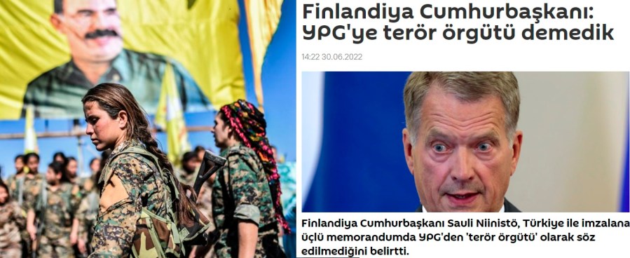 29 Haziran İspanya’daki NATO zirvesinde Türkiye, Finlandiya ve İsveç üçlü bir anlaşma yaptı ve anlaşmaya göre Finlandiya ve İsveç Türkiye’ye terör konusunda destek verecek ve terör örgütlerine silah göndermeyecek ayrıca Türkiye’ye yaptıkları silah ambargosunu da kaldıracaklardı. Sonuç ne oldu dersiniz? Daha aradan 1 gün geçmeden Finlandiya U dönüşü yaptı. 30 Haziran 2022’de açıklama yapan Finlandiya YPG’yi terör örgütü olarak tanımadığını ifade etti. Finlandiya Cumhurbaşkanı Sauli Niinistö, Türkiye ve İsveç’le imzaladığı üçlü memorandumla ilgili “YPG’ye terör örgütü demedik. Erdoğan, YPG’nin metinde olmasını istedi ve biz de onayladık. Değişen bir şey yok” açıklamasında bulundu. Finlandiya gazetesi Helsingin Sanomat’ın aktardığına göre şunları şöyledi: