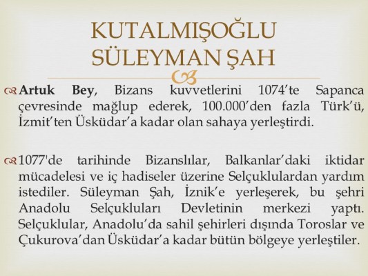 Selçuk Bey’in torunu, Kutalmış’ın oğlu Süleyman Şah (1075-1086) Alparslan döneminde Selçuklu Devleti’nde hizmetlerde bulunmuş, Sultan Melikşah’ın tahta geçmesini takip eden yıllarda Anadolu’daki fetih hareketlerine başlamıştır. Süleyman Şah, Anadolu’daki fetihlerini Marmara Denizi yönüne çevirmiş, İznik’i alarak Türkiye Selçuklu Devleti’nin başşehri yapmıştır. Süleyman Şah, 1075 yılında bağımsızlığını ilan etmiştir.
