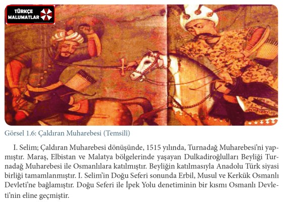Şahkulu İsyanı’nın bastırılmasından sonra 1512’de yeniçerilerin desteğini alan I. Selim, babasını tahttan indirerek Osmanlı Devleti’nin başına geçmiştir. Devlet içinde gücünü artıran I. Selim, Anadolu ve İran coğrafyasında hâkimiyet kurmaya çalışmıştır. I. Selim 1514 yılında Safeviler üzerine sefere çıkmıştır. Doğu Seferi’nde I. Selim Dulkadiroğulları Beyliği’nden kendilerine katılmalarını istemiştir ancak Memlûklular’ın kışkırtmaları sonucunda Dulkadiroğulları Beyliği, Osmanlı Devleti’ne katılmamıştır. Osmanlı kuvvetleri ile Safevi kuvvetleri 1514 yılında Çaldıran mevkiinde karşılaştılar (Görsel 1.6). Çaldıran Muharebesi’nde Safeviler mağlup olmuştur. Şah İsmail yaralı olarak İran içlerine kaçmak zorunda kalmıştır. Safeviler’in Doğu Anadolu’daki varlığına son verilmiştir.