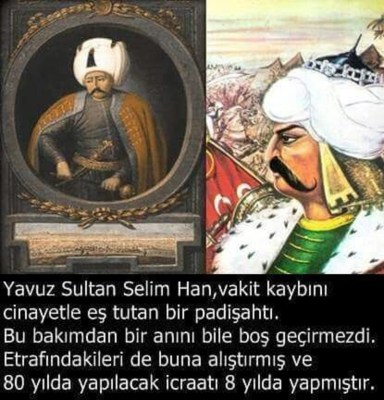 Yavuz Sultan Selim Han vakit kaybını cinayetle eş tutardı. Bu yüzden 80 yıllık işi 8 yılda başarmıştır. Vakit kaybından nefret eden padişah, her anını değerlendirir, çok az uyur, sürekli plan yapardı. Hatta bir dönem devleti vezirsiz yönetmiştir. Yavuz’dan sonra gelen padişahlar asla Yavuz gibi ihtişamlı ve temeli sağlam bir devlet geriye bırakmamıştır. Her gelen daha çok borçlanmış, daha çok harcama yapmıştır. Yavuz ise hazineyi ağzına kadar doldurmuş, isyanları bastırmış, mükemmel bir devlet düzeni bırakmıştır. Özellikle son padişahlar israfta çığır açmış, halk açlıktan ölürken koca koca sarayla yaptırıp keyif çatmıştır.