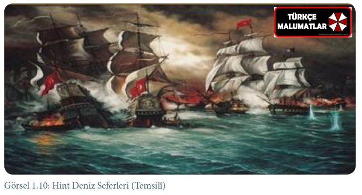 Coğrafi Keşifler ile Vasco de Gama’nın, Afrika’nın güneyini dolaşarak Hindistan’a ulaşması yeni ticaret yollarının bulunmasını sağlamıştır. Portekizliler sömürgecilik faaliyetlerine başlayarak Hindistan’da koloniler kurmuşlardır. Bununla birlikte Basra Körfezi ve Kızıldeniz gibi önemli su yollarının girişlerini kontrol altına almışlardır. Portekizlilerin bu tutumundan dolayı Hindistan’da bulunan Gücerat Sultanı ve Baharat Yolu üzerinden mal taşıyan tüccarlar Osmanlılar ve Memlûklerden yardım istemiştir. Kanuni Dönemi’nde Osmanlılar Müslümanlara yardım etmek ve Baharat Yolu’nun güvenliğini sağlamak amacıyla harekete geçmişlerdir. Osmanlı Devleti stratejik olarak Akdeniz dışına yönelmiştir. Hint Okyanusu’na açılan Osmanlı Devleti, Portekizliler üzerine dört sefer düzenlemiştir (Görsel 1.10). Osmanlı Devleti bu seferlerden istediği sonucu alamamıştır.