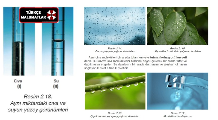 Su ve cıvanın moleküllerinin bir arada bulunma eğilimi farklıdır. Yapılan araştırmalar cıva molekülleri arasındaki birbirini tutma kuvvetinin su molekülleri arasındaki tutma kuvvetinden büyük olduğunu göstermiştir. İki özdeş ölçekli cam tüpe eşit miktarda birine cıva diğerine de su koyarak gözlemlendiğinde yüzeylerinin Resim 2.18’deki gibi bir görünüm aldığı görülür. Bunun nedenini şimdiye kadar öğrendiklerimizle açıklayalım: