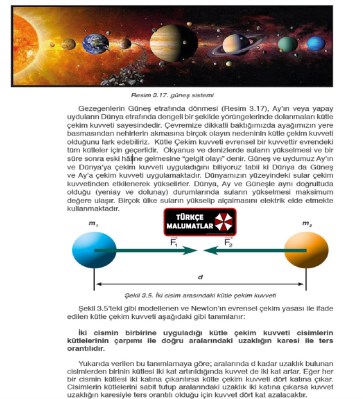 Gezegenlerin Güneş etrafında dönmesi (Resim 3.17), Ay’ın veya yapay uyduların Dünya etrafında dengeli bir şekilde yörüngelerinde dolanmaları kütle çekim kuvveti sayesindedir. Çevremize dikkatli baktığımızda ayağımızın yere basmasından nehirlerin akmasına birçok olayın nedeninin kütle çekim kuvveti olduğunu fark edebiliriz. Kütle Çekim kuvveti evrensel bir kuvvettir evrendeki tüm kütleler için geçerlidir. Okyanus ve denizlerde suların yükselmesi ve bir süre sonra eski hâline gelmesine “gelgit olayı” denir. Güneş ve uydumuz Ay’ın ve Dünya’ya çekim kuvveti uyguladığını biliyoruz tabii ki Dünya da Güneş ve Ay’a çekim kuvveti uygulamaktadır. Dünyamızın yüzeyindeki sular çekim kuvvetinden etkilenerek yükselirler. Dünya, Ay ve Güneşle aynı doğrultuda olduğu (yeniay ve dolunay) durumlarında suların yükselmesi maksimum değere ulaşır. Birçok ülke suların yükselip alçalmasını elektrik elde etmekte kullanmaktadır.