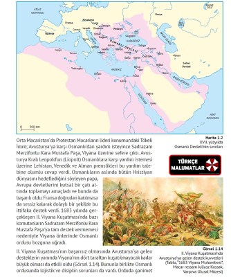 II. Viyana Kuşatması’nın başarısız olmasında Avusturya’ya gelen desteklerin yanında Viyana’nın dört taraftan kuşatılmayacak kadar büyük olması da etkili oldu (Görsel 1.14). Bununla birlikte Osmanlı ordusunda lojistik ve disiplin sorunları da vardı. Orduda ganimet hırsıyla hareket eden askerler asıl işlerini yapmayı bıraktı. Osmanlı askerleri Viyana’nın konumu sebebiyle güçlerini bir noktada toplayamazken rakipleri tek bir merkez etrafında savunma yapabiliyordu. Sefer yolunun uzaklığı nedeniyle kuşatmaya hafif toplarını götüren Osmanlı, ateş gücü bakımından düşmanının gerisinde kaldı. Ayrıca Osmanlı ordusunda zahire kıtlığı görülmeye başlamış, süvarilerin atlarına ve topları çekecek öküzlere bile yem verilemez olmuştu. Bütün bunlara rağmen savaşın kaderini değiştiren asıl olay Lehistan kralının Bavyera ve Saksonya kuvvetleriyle birleşerek beklenenden önce Viyana önlerine gelmesi ve Osmanlı ordusunu iki ateş arasında bırakması oldu.