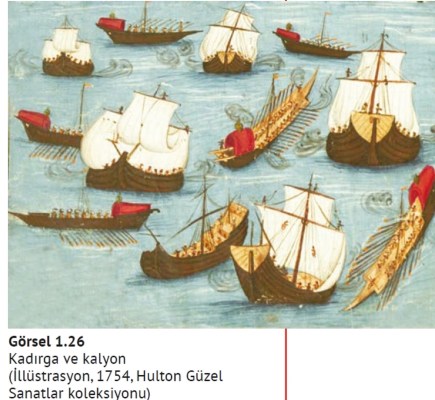 Avrupalı devletler, Atlas Okyanusu’ndaki güçlü gelgit akıntıları ve rüzgârlar nedeniyle kadırgalarla ne ticaret ne de savaş yapabiliyordu. XV. yüzyıl sonlarından itibaren okyanus gemiciliği gelişti ve XVI. yüzyıl sonundan itibaren Avrupalı devletler yelkenli gemilere geçerek kalyonları birer top bataryasına dönüştürdü. Böylece deniz savaşları yeni bir nitelik kazandı. Akdeniz’in iklim şartlarına uygun olarak ve zaman içerisinde geliştirilen kadırgalar, bu coğrafyada uzun yıllar kullanılmıştı. Ancak XVI. yüzyıl sonlarından itibaren Akdeniz’e gelen İngiltere ve Hollanda’nın kalyonları, kadırgalara üstünlük sağlayarak Akdeniz’e hâkim olmaya başlamıştı. Bu devletlerin gemilerini kiralayan Venedik, Girit’i kuşatan Osmanlı donanmasını engelleyerek denizde Osmanlılara karşı üstünlük sağlamayı başardı. Venedik kalyonları karşısında Osmanlı kadırgalarının âciz kalması sonucunda Osmanlı devlet adamları kalyon inşasına karar verdi ve böylece kadırgadan kalyona geçiş süreci Osmanlı donanması için de başladı (Görsel 1.27). Dolayısıyla Girit Seferi, Osmanlı gemi teknolojisindeki değişimde ve donanma stratejisinde önemli bir dönüm noktası oldu.