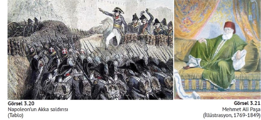 Fransızların Mısır’ı işgal etmesinden farklı sebeplerle kaygı duyan Avusturya da İngiltere’nin yanında savaşa girmiştir. Bu arada Mısır üzerinden Filistin’e ilerleyen Fransız kara ordusu, Akka önlerine gelmiştir (Görsel 3.20). Burada Cezzar Ahmet Paşa komutasındaki Osmanlı birlikleri karşısında başarısız olan Napoleon, Mısır’a dönmek zorunda kalmıştır. Ardından Osmanlı ordusu, Mısır’a girdiyse de başarısız olmuş ve Filistin’e geri çekilmiştir. İngilizlerin Süveyş’e çıkması üzerine Fransızlar Mısır’ı boşaltmak zorunda kalmıştır. Mehmet Ali Paşa, Mısır’ı Fransız işgalinden kurtarmak için 1799 yılında Kavala’dan gönderilen seçme askerlerin başında Kahire’ye gelmiştir. Fransızların Kahire’yi boşaltmasından sonra kısa sürede buradaki başıbozuk askerleri yönetimi altına alan Kavalalı Mehmet Ali Paşa, bu askerlerin komutanı olmuştur. Mehmet Ali Paşa, hızlı bir şekilde Mısır’da kendi otoritesini kurmayı başarmış ve bu nedenle 1805’te buraya vali olarak atanmıştır.