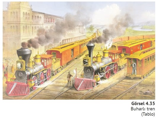 Sanayi Devrimi ile birlikte Avrupalı devletler yüksek kapasiteli, ucuz maliyetli ve güvenli bir taşıma sistemine ihtiyaç duymuştur. Bu nedenle XVIII. yüzyılın ortalarından itibaren Avrupa’da yol ve kanal inşası gelişmiştir. Yapılan bu yollar ve kanallar sayesinde hem insanlar hem de ürünler daha süratli ve daha ucuza taşınmıştır. XIX. yüzyılda kapitalist devletler, ham madde ve pazarlara kolay ulaşabilmek için yeni bir ulaştırma aracı olan treni icat etmiştir. Buhar gücünün ulaşımda kullanılmasıyla ortaya çıkan tren ve demiryolu ağı, kapitalist devletlerin etkinliğini ve gücünü artırmıştır (Görsel 4.35). Avrupa’da ilk başarılı demiryolu 1830’da İngiltere’de açılmış ve kısa sürede bu ülkenin önemli şehirleri demiryoluyla birbirine bağlanmıştır. 1870’lere gelindiğinde Batı Avrupa, oldukça sık bir demiryolu ağı ile kaplanmıştır. Zamanla bu yeni teknolojinin emniyeti artırılmış, sürati ve taşıma kapasitesi yükseltilmiştir. Limanlar; demiryolu ile iç bölgelere bağlanarak buğday, kömür, demir gibi ağır ve hacimli mallar daha ucuz ve daha hızlı bir şekilde taşınmıştır.
