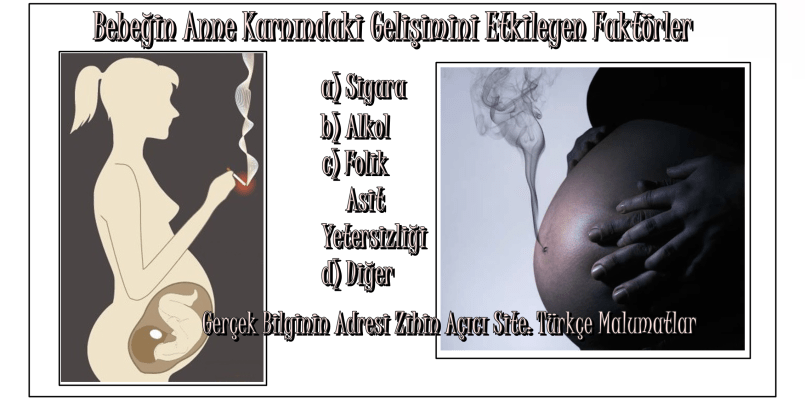 Bebeğin anne karnındaki gelişimini etkileyen birçok faktör vardır. Bunlardan bir kısmı fetuse (anne karnındaki bebek) ait yapısal bozukluklar ya da hastalıklar, diğer bir kısmı ise anneyle ilgili durumlardır. Hamilelikte sigara içilmesi, alkol ve uyuşturucu kullanımı, folik asit yetersizliği gibi etkenler bebeğin gelişimini olumsuz etkiler.