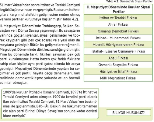 31 Mart Vakası’ndan sonra İttihat ve Terakki Cemiyeti özgürlükçü tavrından vazgeçmiştir. Bu durum İttihatçılara karşı muhalefetin gelişmesine neden olmuş ve yeni partiler kurulmaya başlanmıştır Tablo 4.2). II. Meşrutiyet Dönemi’nde Trablusgarp, Balkan Savaşları ve I. Dünya Savaşı yaşanmıştır. Bu savaşların yanında göçler, isyanlar, siyasi çekişmeler ve toprak kayıpları gibi pek çok sosyal ve siyasi olay da meydana gelmiştir. Bütün bu gelişmelere rağmen II. Meşrutiyet Dönemi’nde dört kez sandığa gidilmiştir. Yine bu dönemde farklı fikirleri savunan pek çok parti kurulmuştur. Hatta bazen çok farklı fikirlere sahip olan kişiler aynı parti çatısı altında bir araya gelmiştir. Meşrutiyet Dönemlerinde yapılan bu seçimler ve çok partili hayata geçiş denemeleri, Türk tarihinde demokratikleşme yolunda atılan önemli adımlar olmuştur.