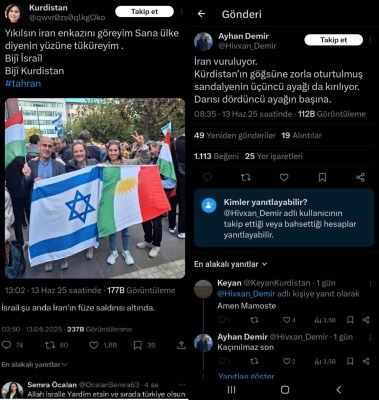 İsrail İran’a füze attıkça Kürtler de zevke geliyor. İnternetin her yerinde büyük Kürdistan haritası paylaşmaya başlayan Kürtler, sıranın Türkiye’ye geleceğinden bahsediyor. Tarihleri boyunca başka devletlere ve uluslara dalkavukluk yapan Kürtler şimdi de İsrail sayesinde Kürdistan’ı kurmak istiyor. Amerika Irak’a saldırınca da bunu en başta destekleyenler Kürtlerdir. Kürtler hem solcu, hem komünist, , hem İsrailci hem de batıcıdır. Her kesimden destek almaya çalışırlar.