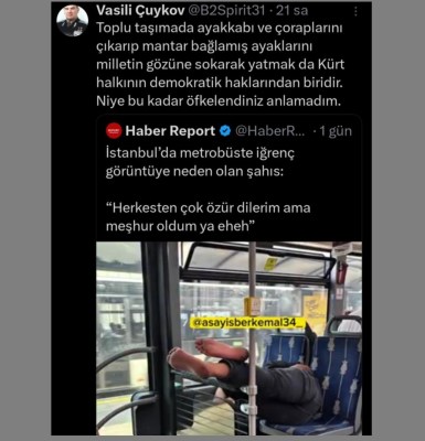 Batı şehirlerinde büyük bir nüfus elde eden Kürtler artık bu şehirlerin de kimyasını bozdu. İzmir, Antalya, İstanbul gibi yerlerde artık yaşanılacak bir şehir olmaktan çıktı. Toplu taşımada sesli konuşanlar kim? Kürtler. Toplu taşımada halay çekenler kim? Kürtler! Toplu taşımada çıplak yakları ile koltuğa oturan ve koltuğu yatak yaparak uyuyan kim? Kürtler. Siz bu kürtlere en ufak bir şey söylerseniz size bıçak çekip saldırıyorlar. Şikayetçi olduğunuzda ise bir şey olmuyor. Çünkü hukuk, adalette Kürtlerin elinde. Sonra sizi yaralıyorlar ya da öldürülüyorlar. Ufak bir ceza ile hapisten de çıkıyorlar. Siz de öldüğünüz ile kalıyorsunuz…