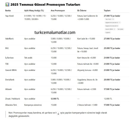 Not: Promosyonlar maaş bandına, ek şartlara ve bankayla yapılan kampanyaların süresine bağlı olarak değişiklik gösterebilir.