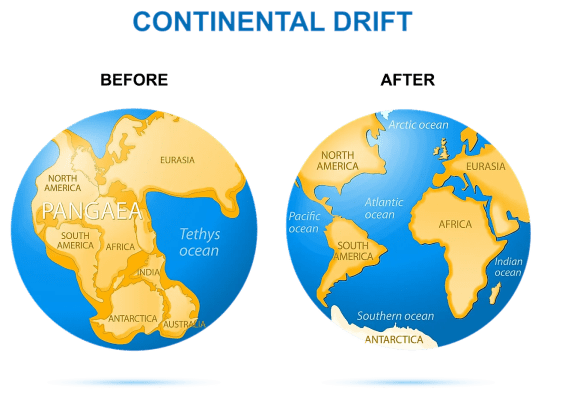 - Pangea’nın Ayrılması: Jura Dönemi’nde (yaklaşık 175 milyon yıl önce) Pangea, güneydeki Gondvana ve kuzeydeki Laurasia olarak ikiye ayrılmaya başladı. Bu iki büyük kara kütlesi de zamanla parçalanarak günümüzdeki kıtaları oluşturdu.
