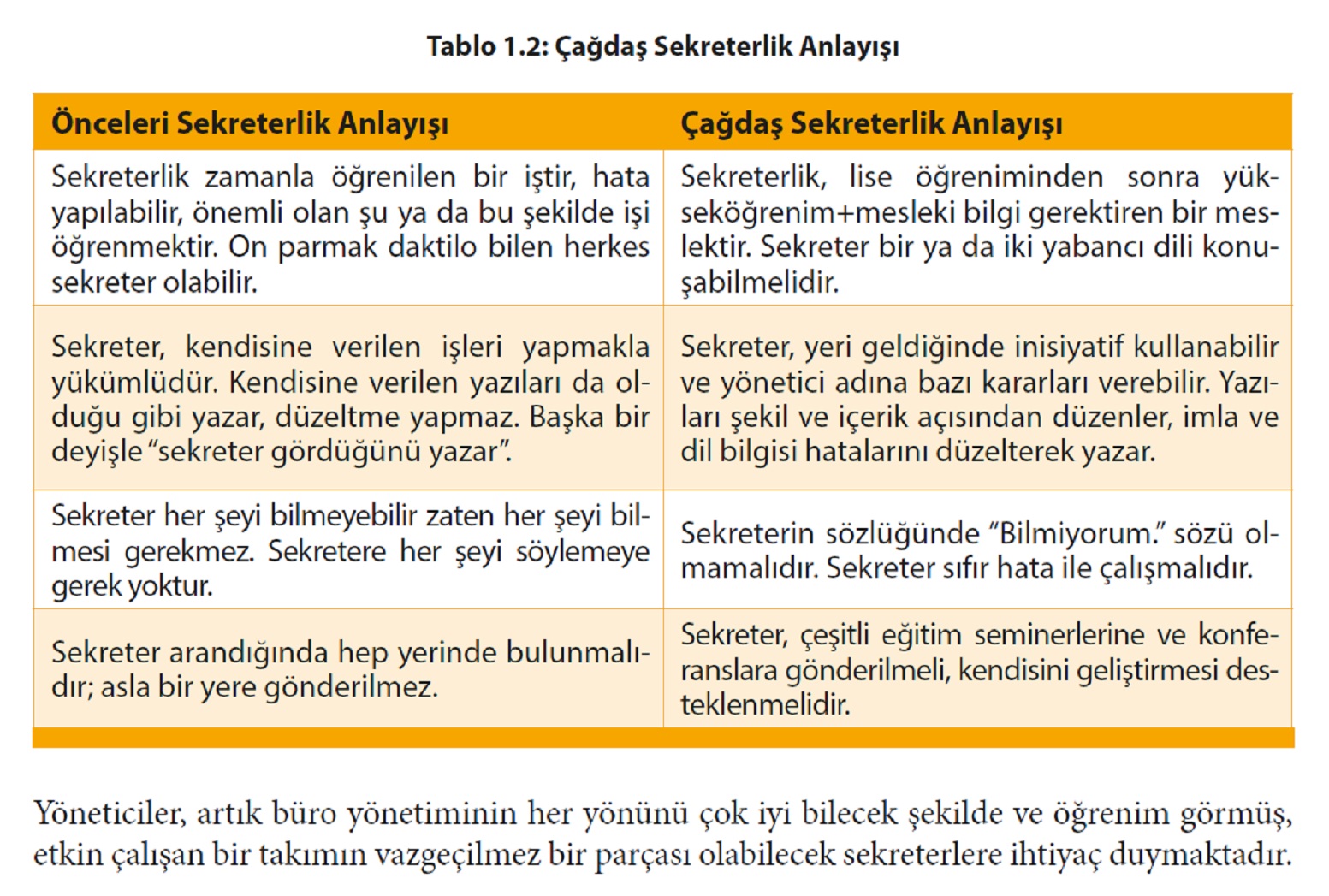 Yöneticilerin sekreterlik mesleğine bakışındaki gelişmeyi gösteren çok iyi bir örnek, büyük bir şirketin başkanının söylemiş olduğu şu sözlerde gizlidir: “Katılıma ve planlamaya zaman ayırmasını sağladıktan sonra, yöneticinin en önemli görevleri arasında sekreterlerin verimli olarak kullanılmasını görürüm.” Şimdi biraz gerilere dönelim ve yöneticilerin sekreterlik hizmetlerine o günlerdeki bakışı ile günümüzdeki sekreterlik anlayışlarını karşılaştıralım.